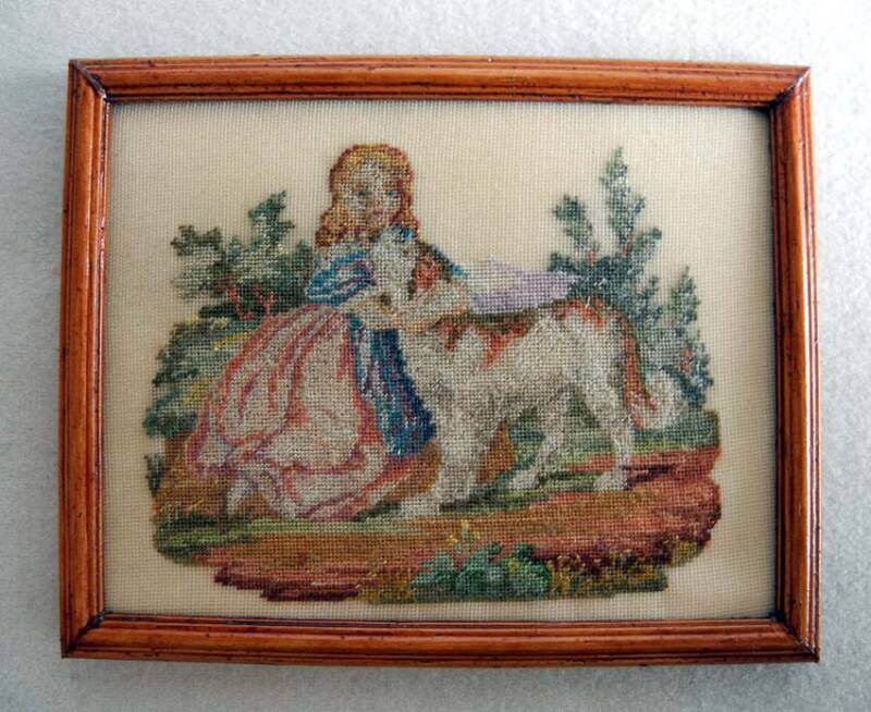 De volgende werkstukken zijn allemaal geborduurd naar oude patronen op zijdegaas van 32 steekjes per cm en met mijn zelf geverfde garen.
