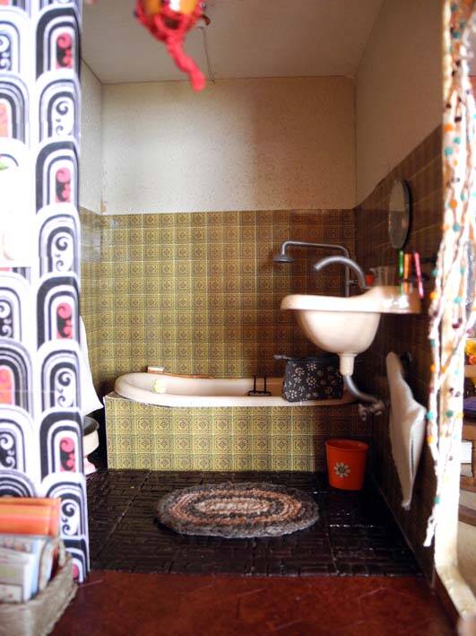 Ook in de badkamer hadden we vreselijk lelijke tegels. Het sanitair is Bahama beige. De onverslijtbare, maar vreselijk lelijke badmat is gehaakt van repen panty. De wc. staat, om nog een beetje privacy te hebben, achter het muurtje.