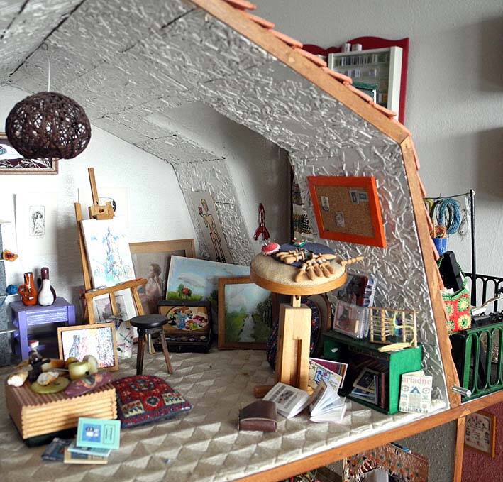 Op de zolder beoefent Annelies al haar hobbies: naaien, spinnen, weven, breien, kantklossen, wol verven, enz. Op de vloer van de zolder liggen biezen tegels. Tegen de wand zijn grijze vezelplaten die wit geverfd zijn. De planken van de kast zijn gemaakt van vezelplaat met witte kunststof . En zo zijn de kasten door het hele huis ook; een veel gebruikt materiaal in die tijd. Tussen de planken betonnen siertegels. Goedkoop en doelmatig. In de oranje tas zit de wol die nog gesponnen moet worden. Rechts achter is het schildershoekje. Er staan olieverf schilderijen, aquarellen en etsen aan de muur ( niet door mij gemaakt). En dan die afschuwelijke lamp. Zo maakten we ze aan het eind van de 60-er jaren. En wat je niet zo mooi vindt, dat gaat naar de zolder, nietwaar?