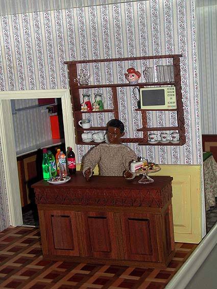 En kijk eens hoe leuk dat staat met het licht aan en de treintafel voor het raam. Helaas besloot ik later om de soos in de kast te zetten zodat dat mooie front er niet meer voor past.