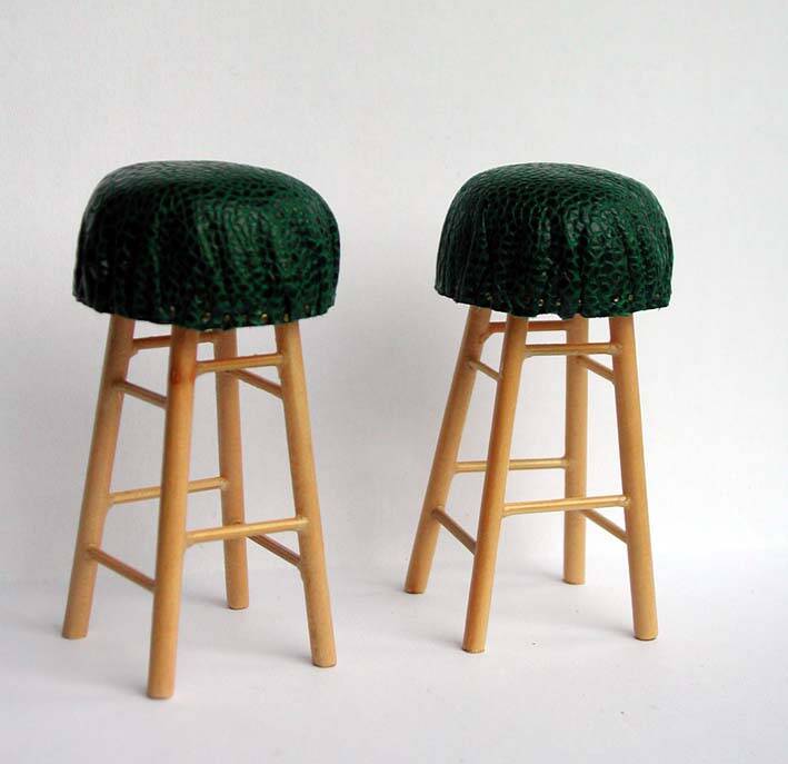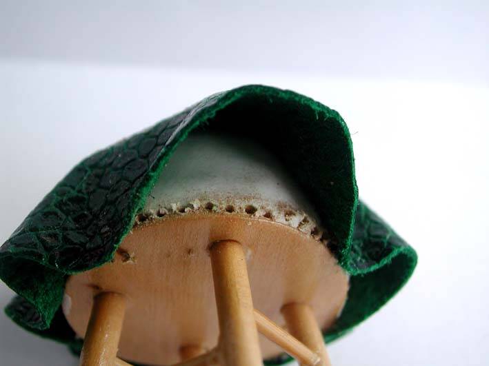 En toen bleken de barkrukken die ik voor bij het werkblad in de treinkamer gekocht had, veel te laag te zijn. Dus eerst maar een laag zelfhardende klei op de kruk en daarna een mooi lapje leer er omheen. Zo zien ze er eigenlijk veel mooier uit.