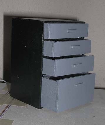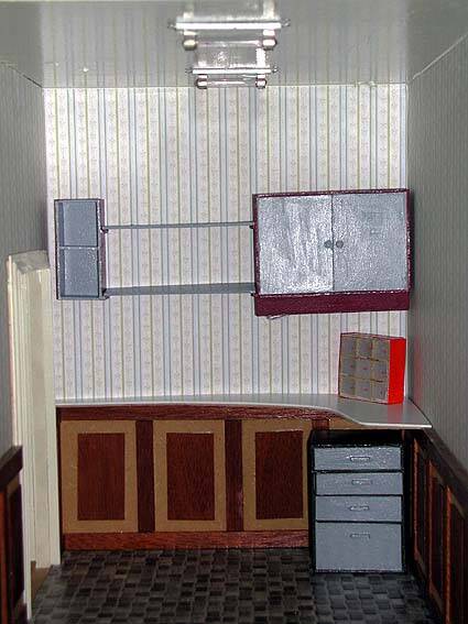 Er moesten meubels gemaakt worden. Dat had ik nog nooit gedaan dus leek het me het verstandigst om te beginnen met de meubels voor de treinkamer. Zelf had ik de kastjes getekend maar hoe vaak ik niet vergeten ben om rekening te houden met de dikte van het hout. En dan steeds maar weer overdoen. Het heeft veel hout gekost maar ik heb er ook veel van geleerd. De deurtjes van de bovenkastjes had ik zo mijn best op gedaan. Ze sloten perfect toen ze nog niet geverfd waren. Helaas konden ze na het verven niet meer open. Weer wat geleerd.