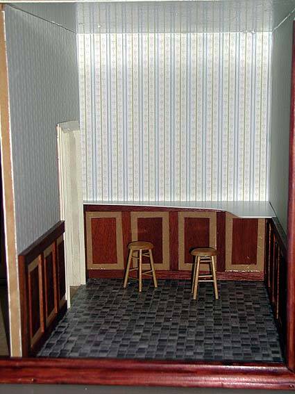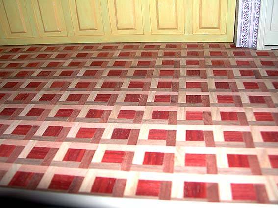 Allereerst een ontwerp gemaakt, daarna hout gekocht. Toen moest dat hout in heel veel kleine stukjes gezaagd worden. Om dit veilig te kunnen doen heb ik eerst, met hulp, een zaagbak gemaakt van een oud sigarenkistje. En toen maar zagen..........eindeloos veel kleine stukjes en die daarna weer aan elkaar geplakt moesten worden! Ook Margriet maakte een parketvloer.